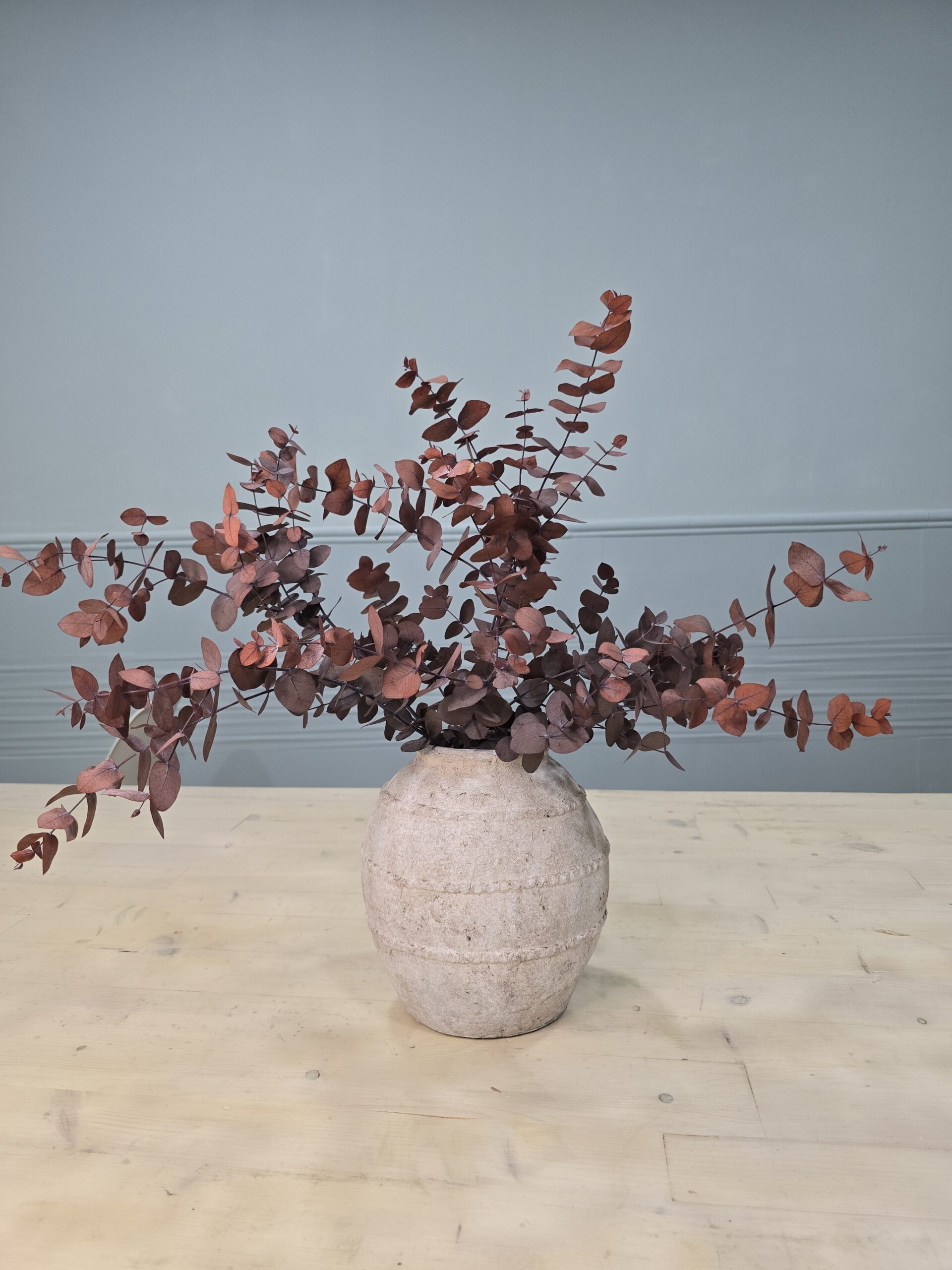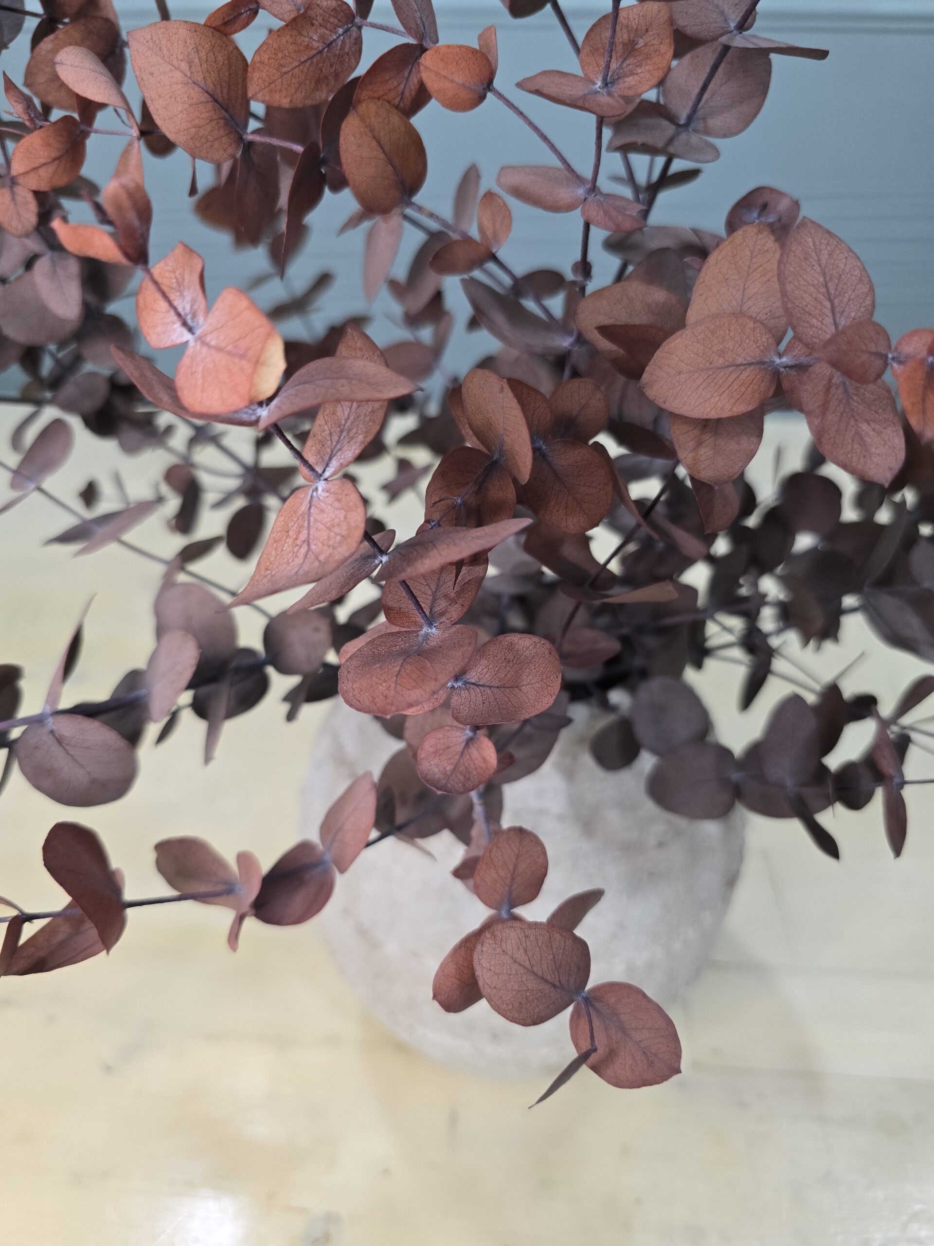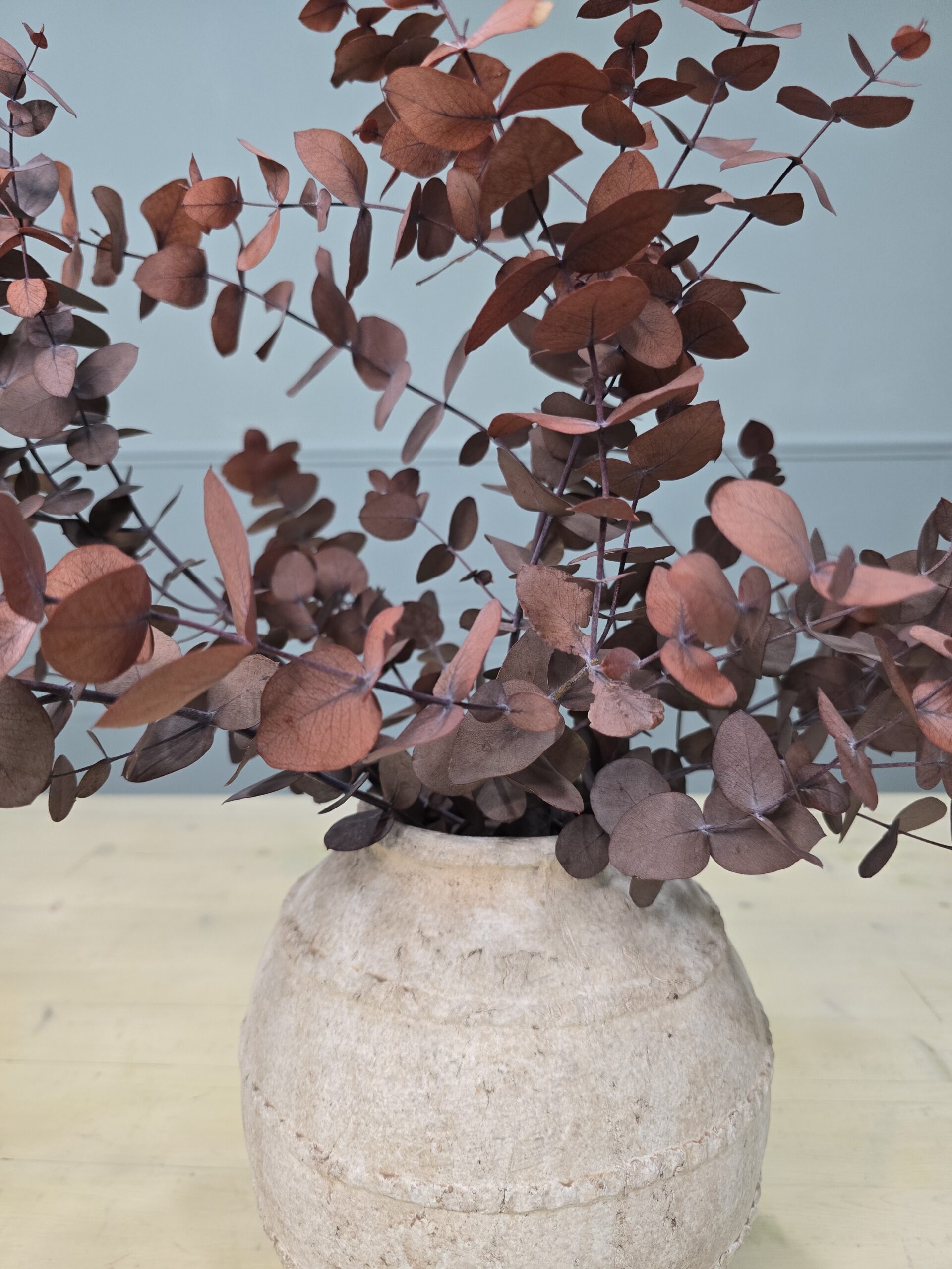 Eucalipto de color mocca preservado de la mejor calidad en un jarrón de cerámica maravilloso.